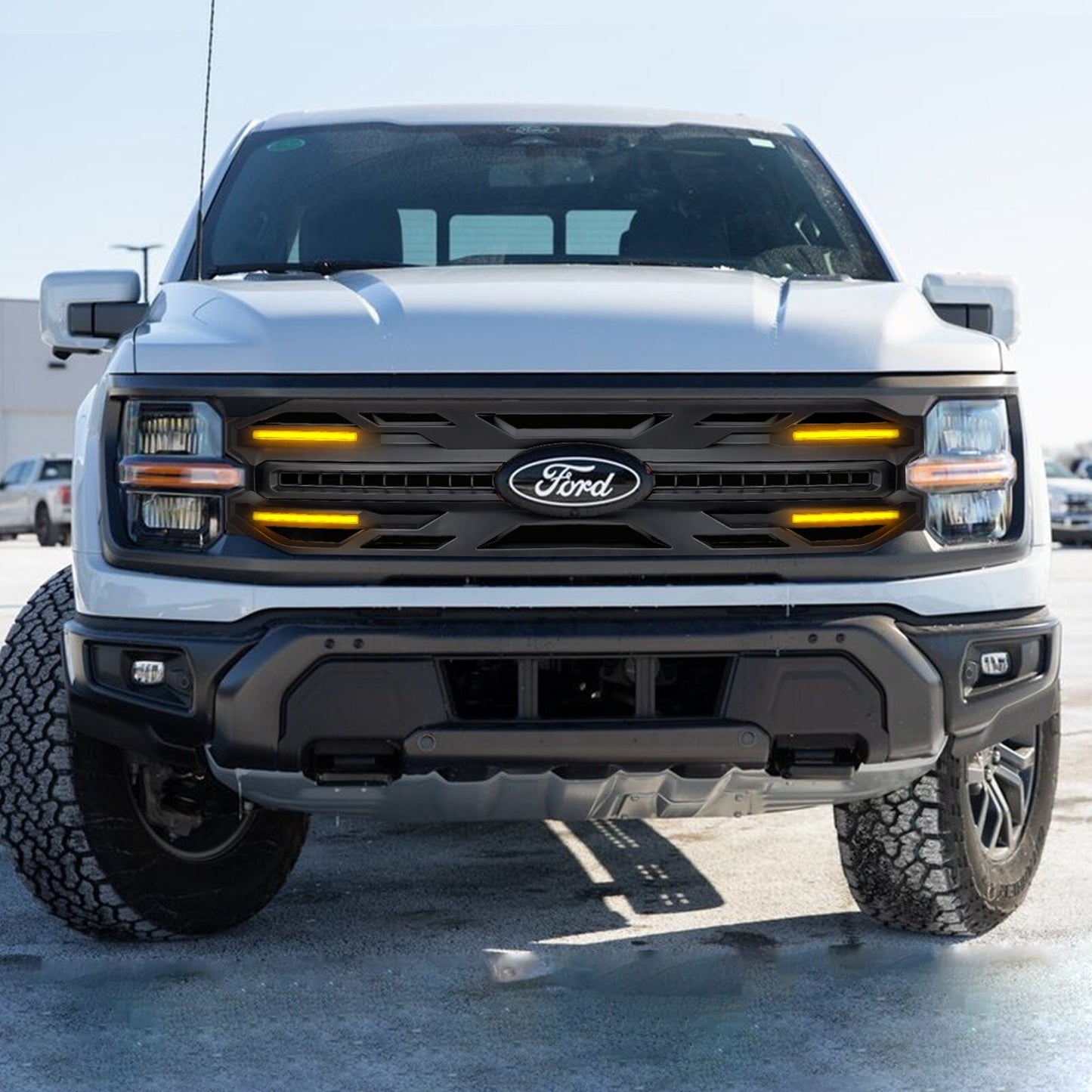Armor Grille w/ Amber Lights & OEM Emblem Hole - Matte Black For 24+ Ford F150 Tremor